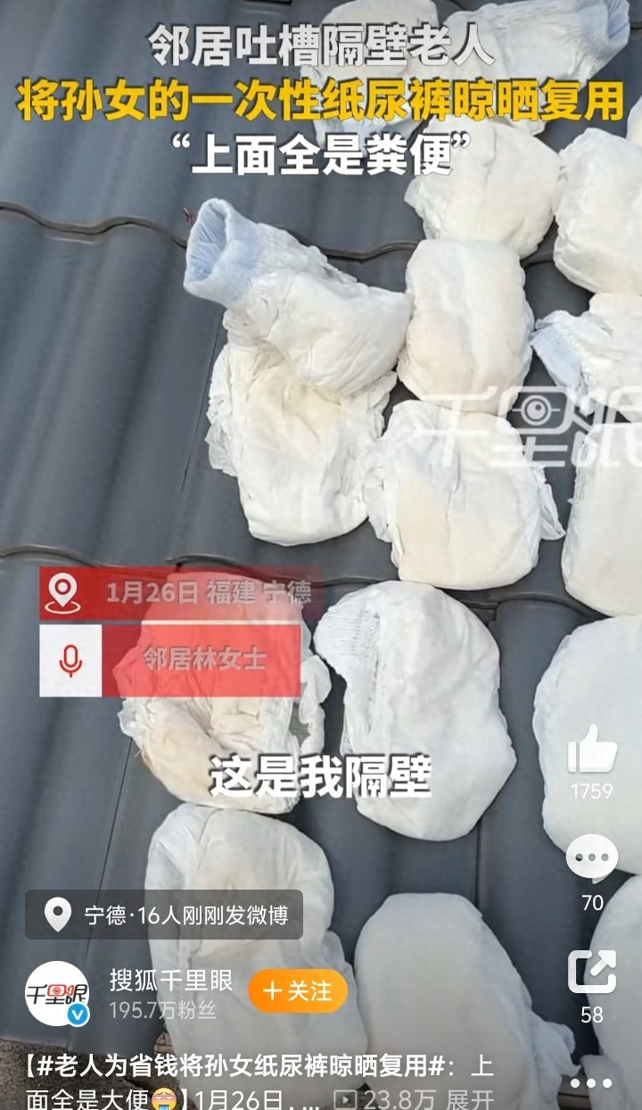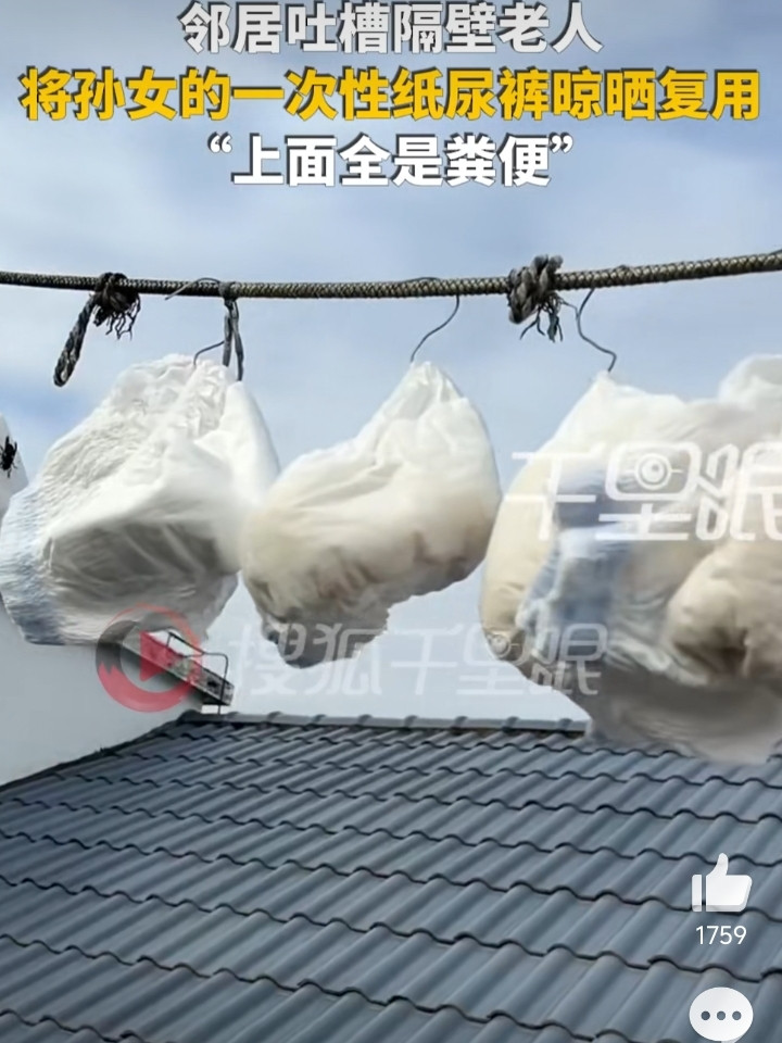 1月26日,福建宁德。林女士反映,隔壁老人将孙女用过的一次性纸尿裤不经清洗,直接晾晒在天台准备重复使用,纸尿裤上还有残留粪便。林女士称,近日多雨且临近春节,自己洗的衣物较多,老人甚至将纸尿裤挂在自己衣服中间晾晒,跟他们说了很多次这样对孩子不好,但老人表示“一天拉太多,买纸尿裤钱受不了”,仍坚持晾晒。孩子的父母也对此不满。但是老人不听